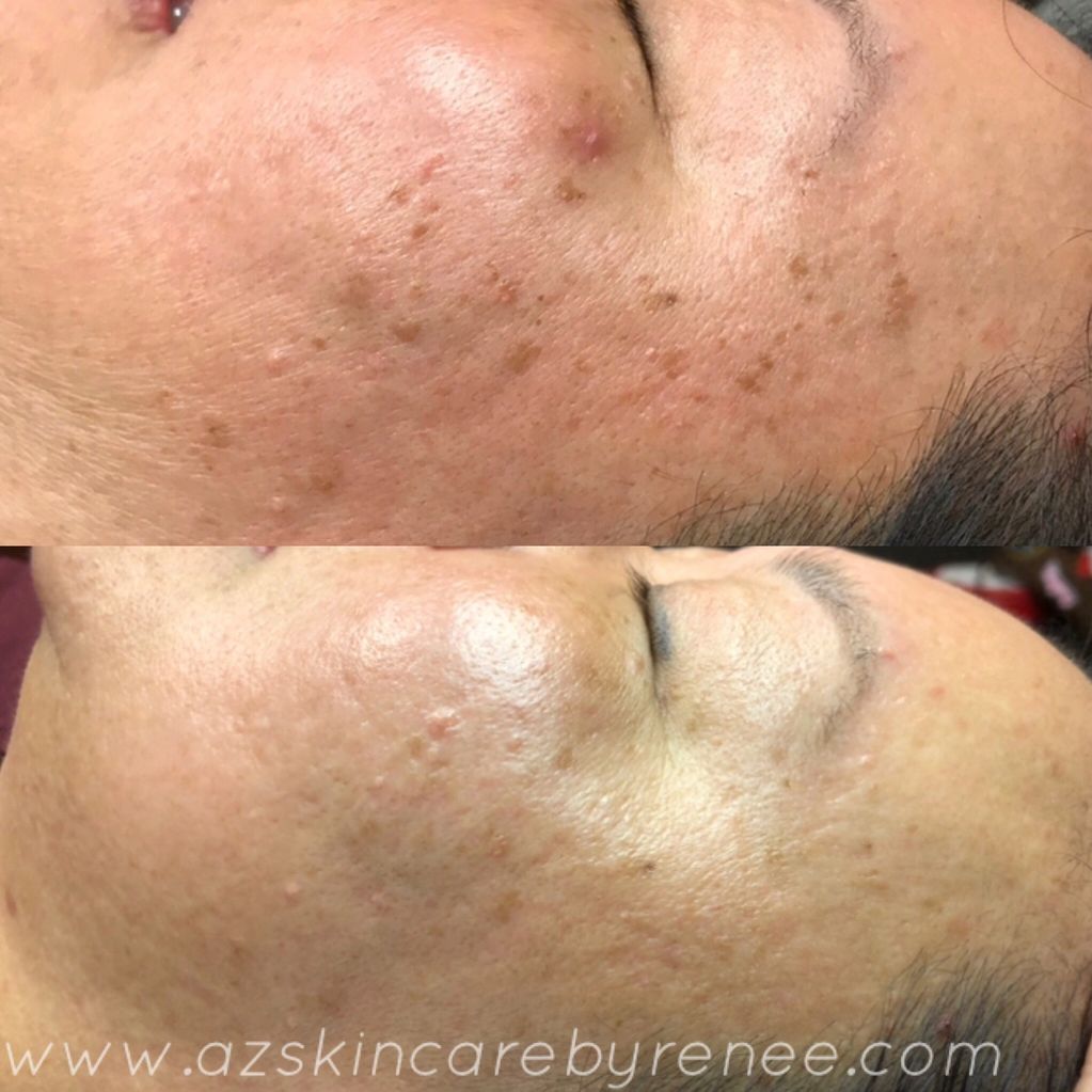 Dermaplane facial every 4 weeks with gentle peels. Regular use of professional skin care products including vitamin C in the form of Ascorbyl Tetraisopalmitate